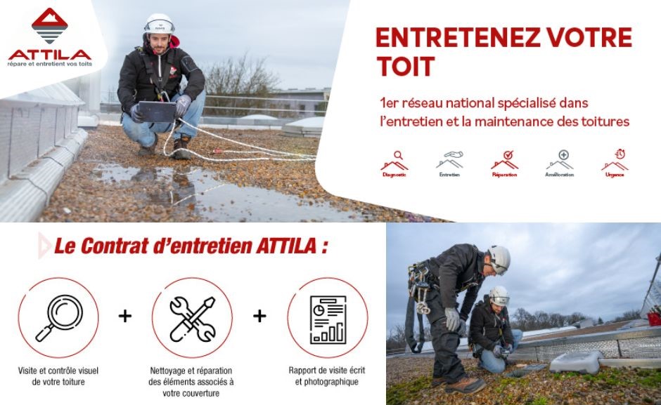 ATTILA est le 1er réseau national spécialisé dans la réparation, l’entretien et la maintenance de tous les types de toits, qu’ils soient industriels, traditionnels, en terrasse ou amiantés.