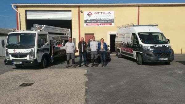 Equipe Attila 26/08/2015 par attila Voici notre équipe ATTILA au complet de gauche à droite : - Un couvreur : Cyril BONVOISIN - le gérant : Mr Patrick GUERITTE - Un couvreur : Natael COUEGNOUX - Une assistante commerciale : Céline KOWAL