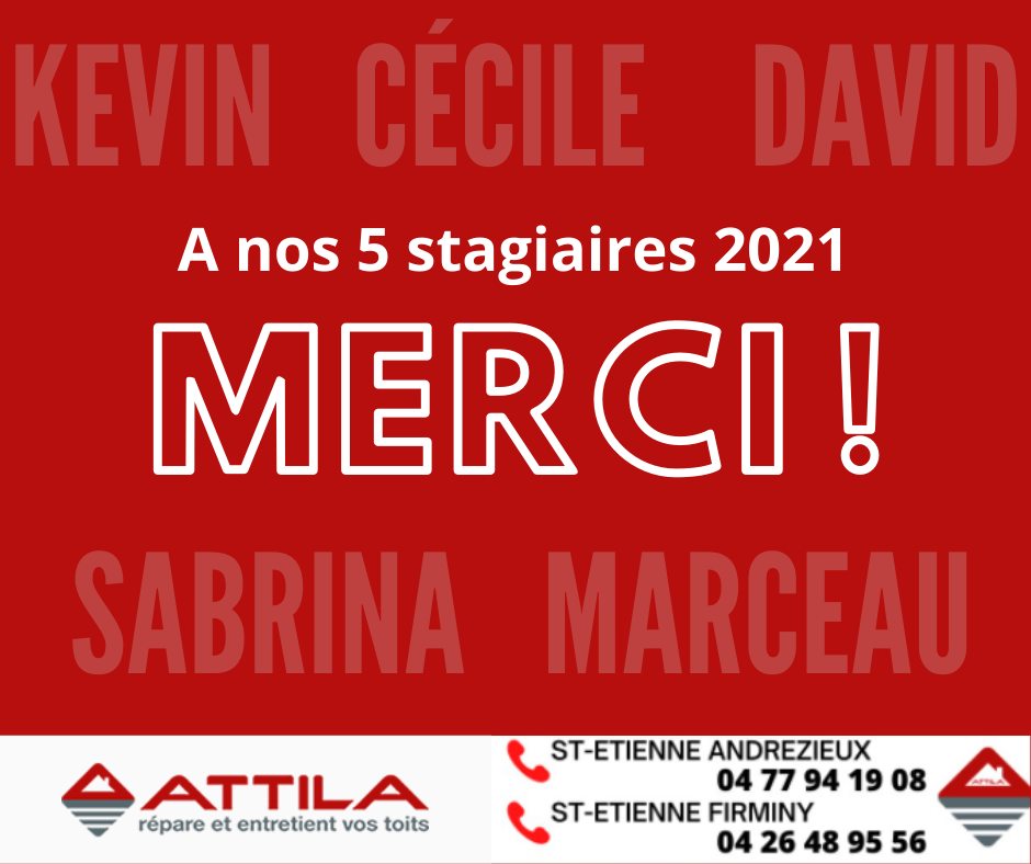 C’est pourquoi toute l’équipe aimerait remercier cinq stagiaires que nous avons eu la chance de rencontrer cette année. Merci à Kevin BEIGNARD, étudiant qui a su redynamiser et booster notre communication sur les réseaux sociaux. Mais également David HUGONNARD, étudiant qui a fourni un travail remarquable sur l’analyse et la mise en place de notre Contrôle Interne/Qualité. Merci à Cécile ASMTOUTZ, en reconversion pour le métier d’assistance de s’être autant investit dans son nouveau métier. Merci à Sabrina SIRGUEY, également en reconversion pour le métier d’assistante pour son dynamisme. Enfin, merci à Marceau TOURIER, collégien en stage découverte, d’avoir choisi Attila pour sa première immersion professionnelle.