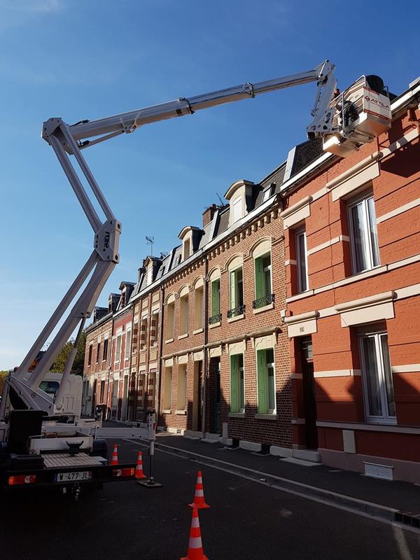 Malgré un accès difficile en toiture, notre équipe Attila Saint-Quentin est intervenue en toute sécurité grâce au camion nacelle pour le nettoyage des chéneaux, le démoussage de la toiture, le remplacement d’ardoises défectueuses et recherche de fuites.