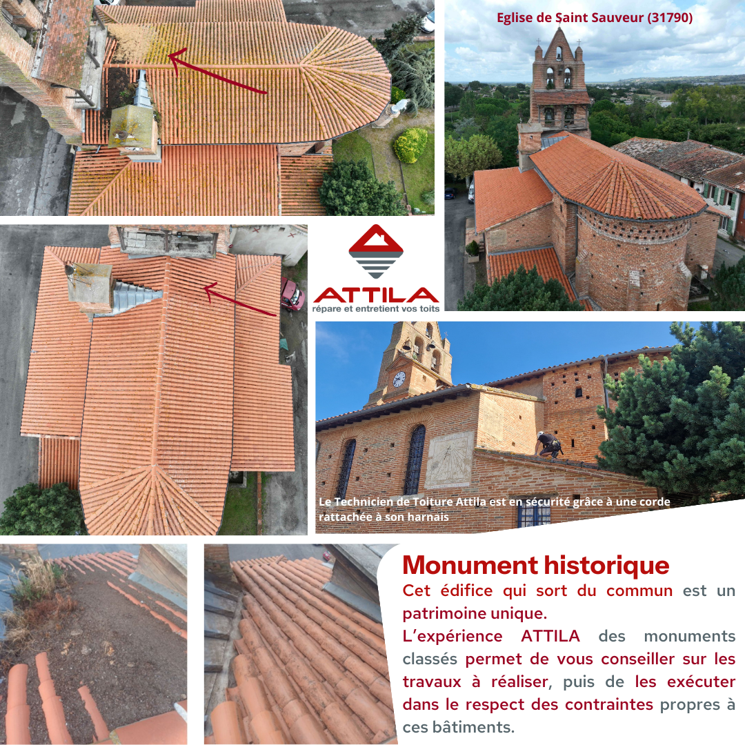 Les équipes de l’agence ATTILA TOULOUSE NORD se sont vu confier le démoussage du toit de l’Eglise de Saint Sauveur. Cet édifice qui date de 1127 est à nef unique, avec un chevet semi-circulaire, et deux chapelles latérales. On peut voir un clocher à cinq arcades sur trois niveaux sur la façade ouest. Cette église est inscrite à l'inventaire des monuments historiques depuis 1979.