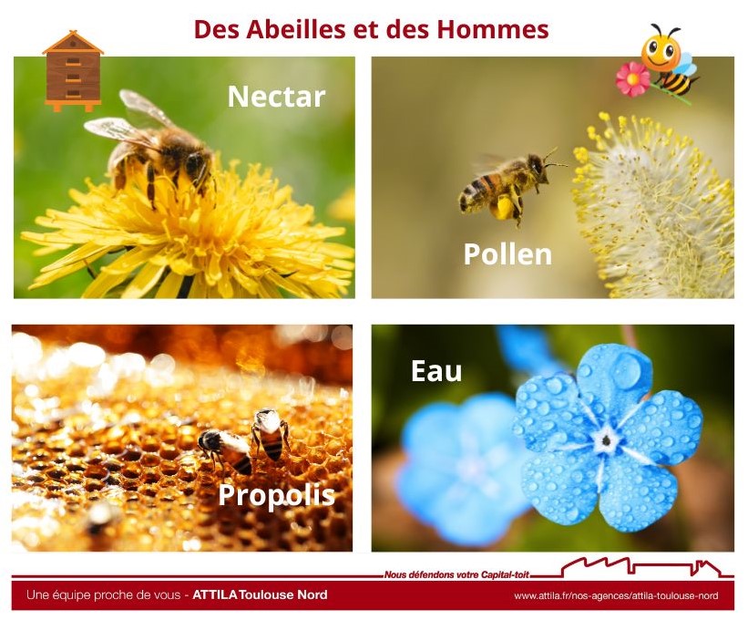Celles-ci sont au nombre de quatre : le nectar bien sûr, mais aussi le pollen, l’eau et la propolis.