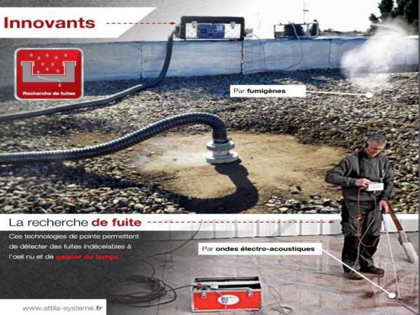 Une fuite d'eau sur une toiture terrasse est un problème d’étanchéité qui doit être pris en compte immédiatement, comme tout souci d’étanchéité, il s’aggrave avec le temps. Les techniques pour localiser précisément l’endroit de la fuite ne sont pas légions. Seule la technique du test à la fumée procure un résultat fiable et immédiat, là où la fumée sort, il y a une fuite. Le principe est le suivant : à l’aide d’un générateur de fumigène (fumée), on injecte la fumée sous la membrane étanche de la toiture terrasse et on inspecte visuellement l’ensemble du complexe d’étanchéité. Notre entreprise utilise la technique d'injection de fumigène comme méthode de recherche de fuite d'eau. Elle permet de vérifier l'intégrité des toitures terrasses dont la membrane étanche n'est pas collée ou soudée au support isolant.