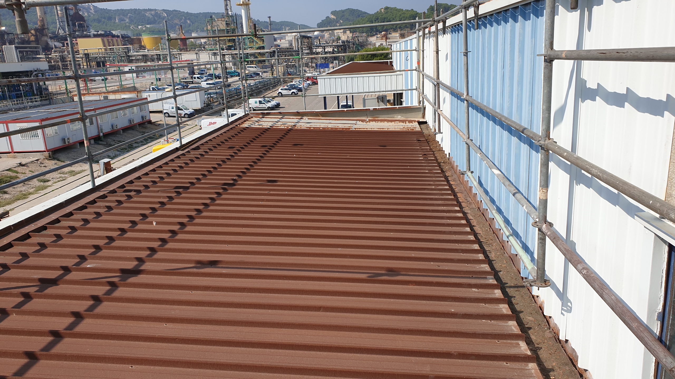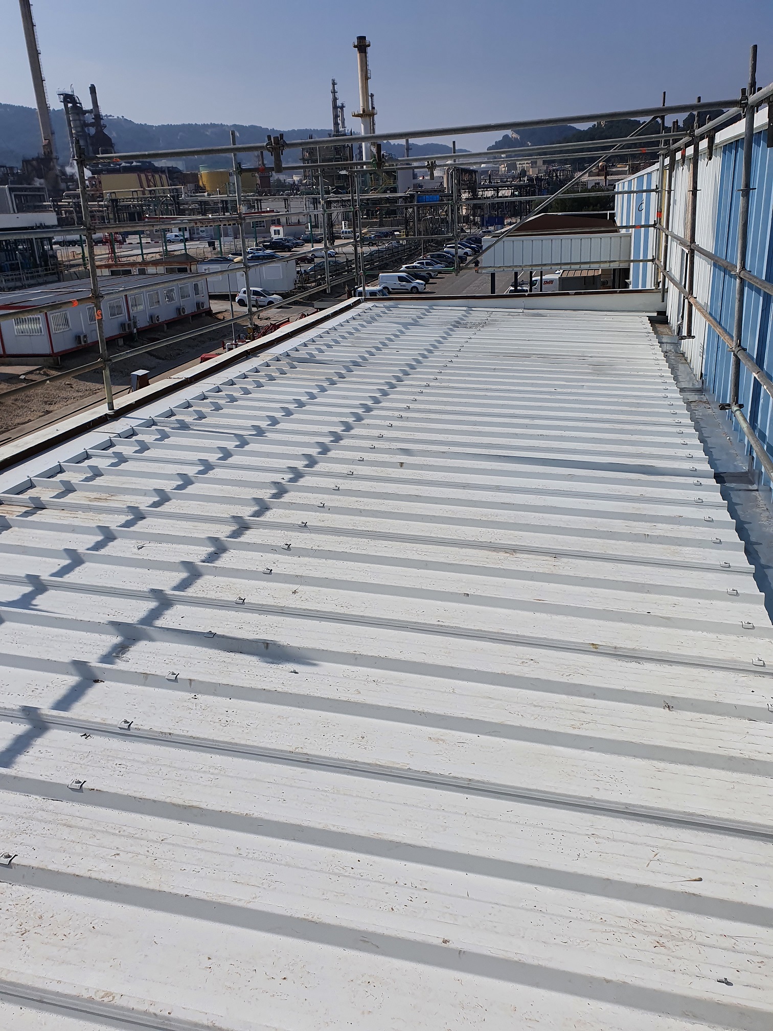 Remplacement des tôles nervurées et d’un chéneau sur un auvent en milieu industriel.