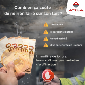 Dans certains cas, le coût indirect (perte d’exploitation, interruption d’activité, dégâts intérieurs) dépasse largement celui des réparations en toiture.