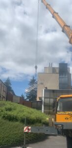 Pour permettre l’acheminement de l’escalier sur la toiture, nos Techniciens de Toitures Attila ont utilisé une grue, qui peut atteindre une hauteur de près de soixante-dix mètres.