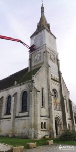 La hauteur de l’édifice nous a amené à utiliser une nacelle articulée de 40 mètres de haut pour une intervention en toute sécurité.