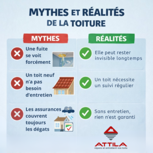 Ces fausses affirmations rappellent l’importance d’une maintenance régulière. Une toiture bien suivie permet d’éviter les imprévus, de maîtriser les coûts et de garantir la pérennité du bâtiment. Faire appel à des experts comme ATTILA, c’est s’assurer d’interventions adaptées, réalisées dans le respect des normes de sécurité et des spécificités de chaque couverture.