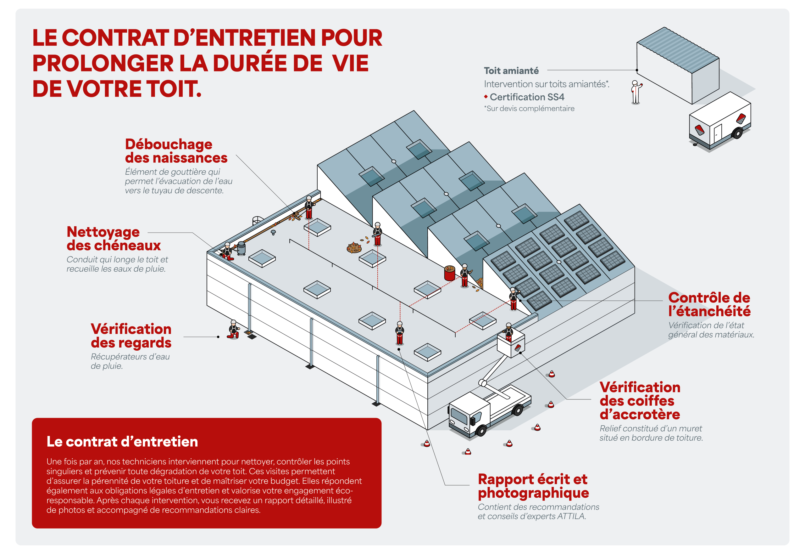 Ce visuel présente les principales actions réalisées lors des visites d’entretien ATTILA, sur tous types de toitures, y compris amiantées (certification SS4).